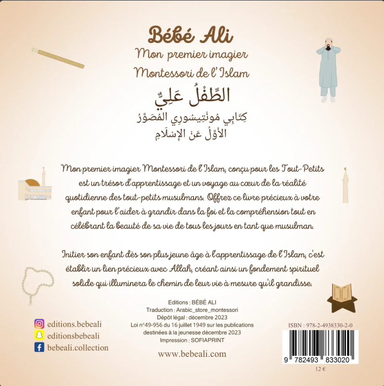 📖 Fidèle à la pédagogie Montessori, ce livre encourage l’autonomie, l’apprentissage par l’image et la répétition, tout en valorisant la réalité vécue par les familles musulmanes. Il célèbre la beauté de la vie quotidienne du petit musulman, tout en nourrissant son cœur et son esprit.