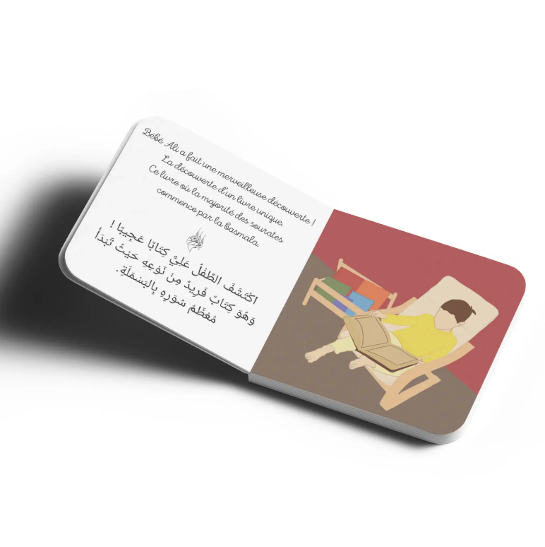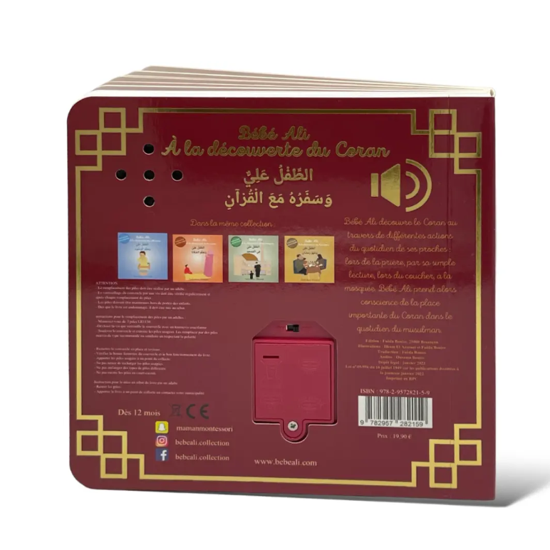 👶 Grâce à ses boutons sonores adaptés aux petites mains, l’enfant peut écouter les versets du Coran en toute autonomie, tout en observant Bébé Ali découvrir la place centrale du Coran dans sa vie quotidienne.