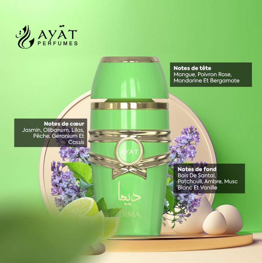 Dima de Ayat Perfumes est une eau de parfum élégante et sophistiquée, aux accords frais, épicés et boisés, pensée pour celles et ceux qui recherchent une fragrance raffinée au caractère classique et intemporel. Harmonieuse et équilibrée, elle évoque la pureté et l’élégance à travers une composition riche et nuancée.
