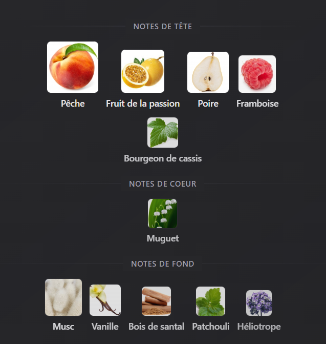 Notes de tête : Pêche, fruit de la passion, poire, framboise, cassis