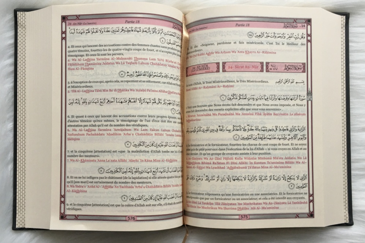 📖 Le texte coranique est présenté en arabe, accompagné d’une traduction officielle en français approuvée par le complexe du Roi Fahd en Arabie Saoudite. Une transcription phonétique en caractères latins est également incluse, facilitant la prononciation correcte pour celles et ceux qui apprennent à réciter le Coran. L’impression en couleur met en valeur la clarté et la beauté des versets, rendant la lecture fluide et confortable.