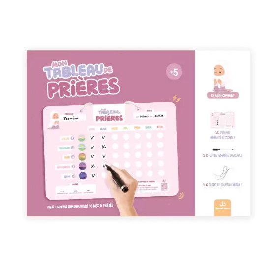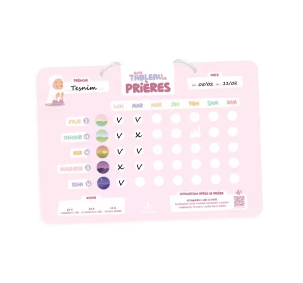 👧🧒 En complétant le tableau chaque jour, l’enfant développe un sens de la responsabilité et ressent une véritable fierté en accomplissant l’acte d’adoration le plus noble. Ce rituel visuel et concret l’aide à s’engager avec constance et enthousiasme dans sa pratique religieuse.
