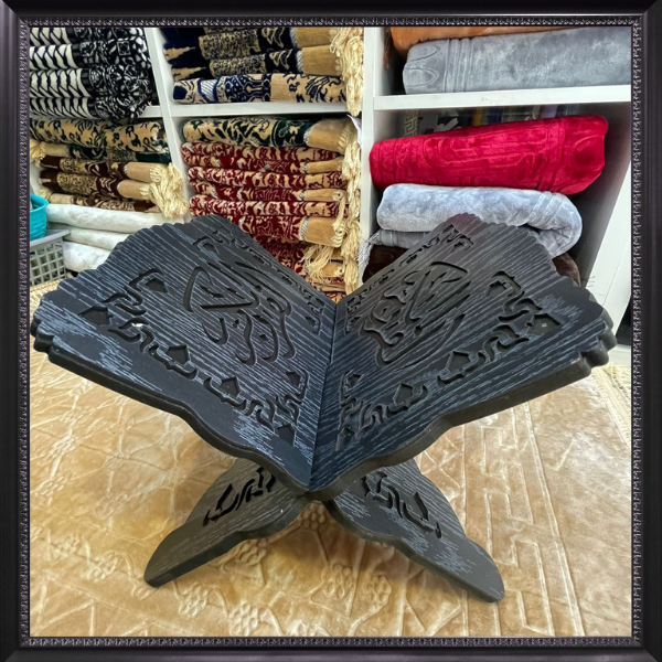 Présentoir Coran format large, finition noire. Conçu pour maintenir votre exemplaire du Coran de manière stable et respectueuse, ce support offre une base solide adaptée aux volumes de grande dimension. Idéal pour la lecture quotidienne ou l'exposition dans un espace dédié à la prière.